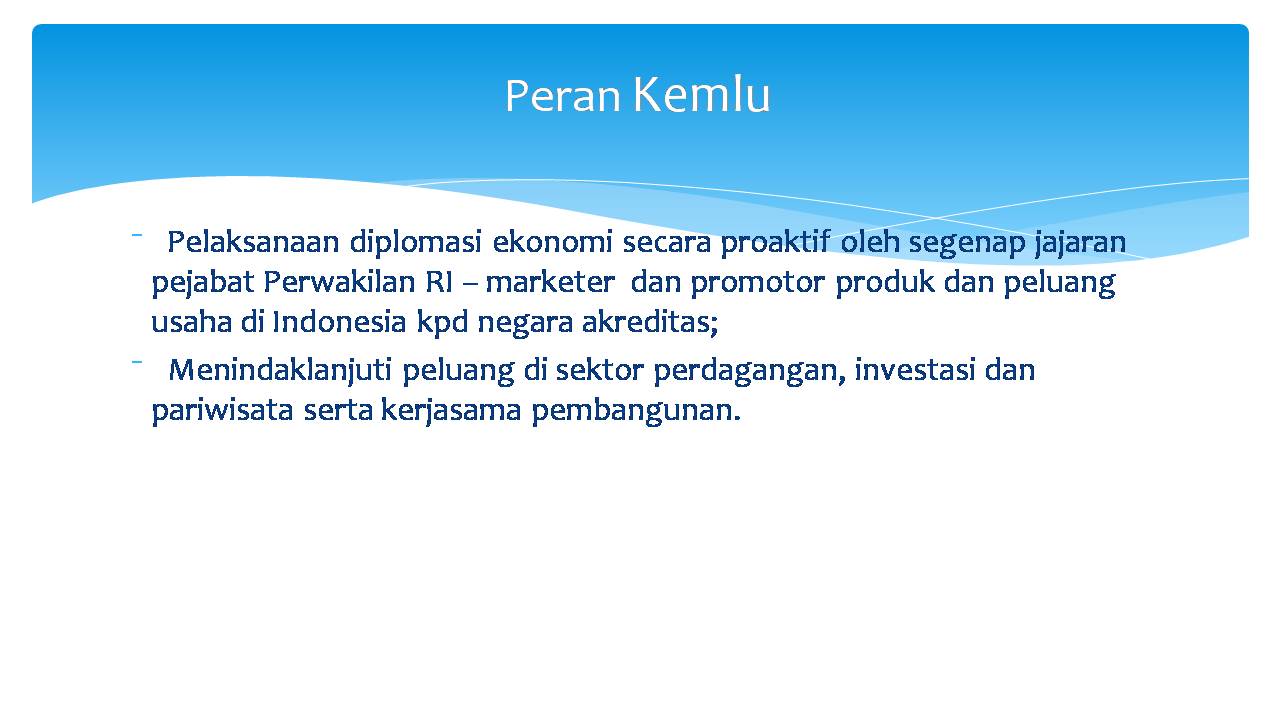 Berikut kami sampaikan materi presentasi dari beberapa nara sumber dalam Dialog Interaktif Peningkatan Diplomasi Ekonomi dan Peluang Menembus Pasar Non Tradisional di Kawasan Amerika dan Eropa. Semoga bagi yang tidak mengikuti acaranya masih bisa mendapatkan informasinya.
